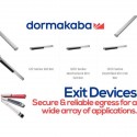 EXIT DEVICES, also known as Panic Exit Devices or Emergency Exit Devices are Door Hardware Products from Dormakaba, ranging from120 Series Exit Bar, 1200 Series Exit Bar, and1300 Series Exit Bar. Also available are Low Energy Swing Door Operators, Door Closers, Mechanical & Pushbutton Locks, Fire/Life Safety Devices, EMF/EMR Series, 1800 Series Exit Devices - Electromagnetically controlled door, EM Series - Electromagnetic door holders and Legacy Products that suit variety of your application needs.